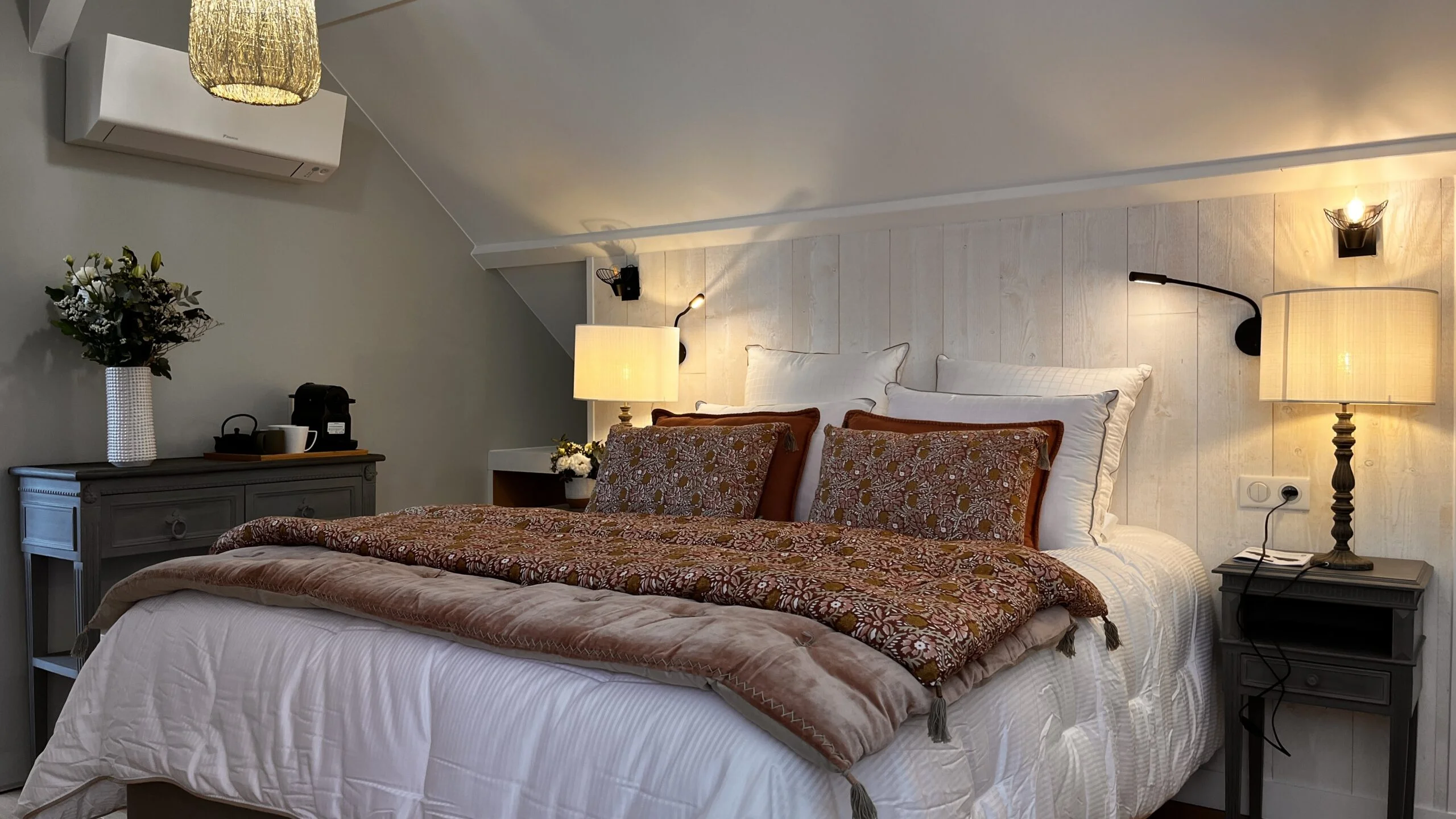 Climatisation, chauffage, wifi, télévision, linge de maison, bouteille d’eau, nécessaire à thé et café, armoire/penderie, coin salon